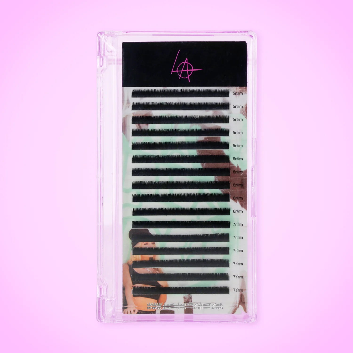 Lash Anarchist .07 Mixed Mega Volume Lashes are designed for bold, dark, ultra-fluffy lash sets. These soft, lightweight fibers fan easily and create full, dramatic looks with clean, consistent bases. The mixed-length tray gives you everything you need for mapping, layering, and building dimension without switching trays.